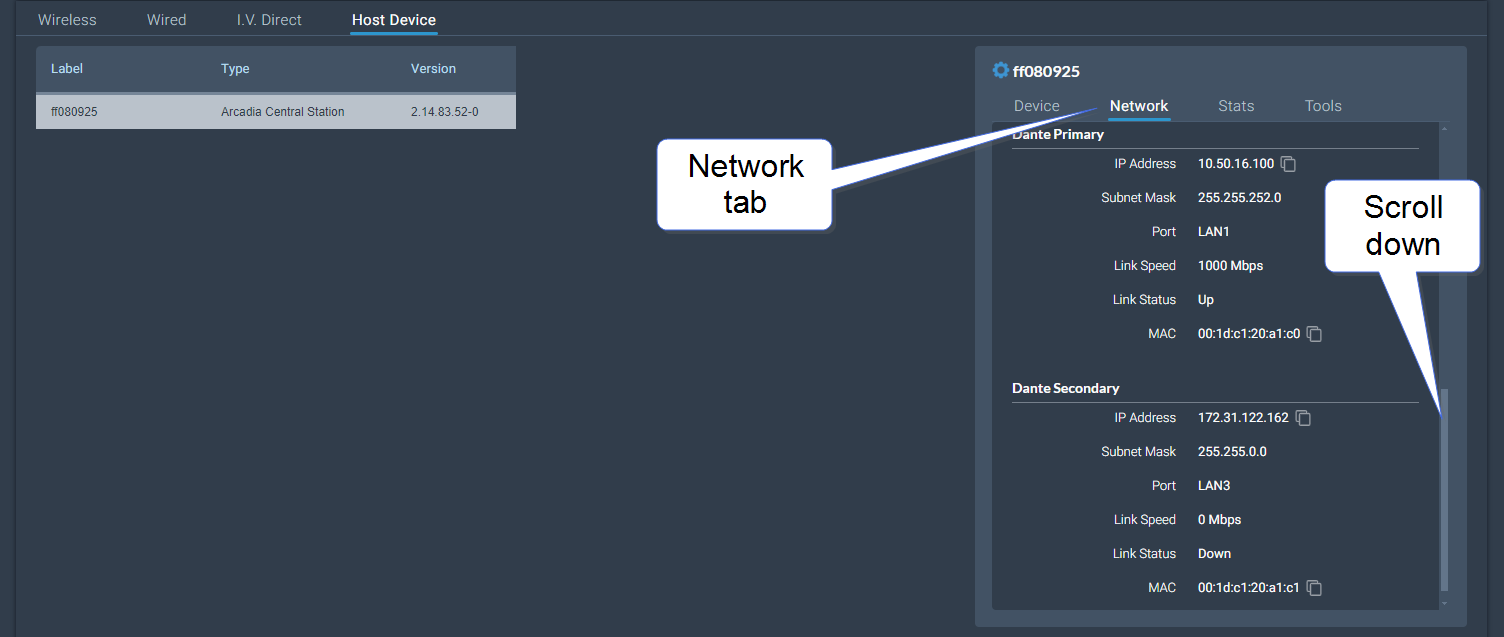 Determining which LAN connector you wish to use for Dante must be done in the CCM. Navigate to Hardware > Host . Under the Network tab, select the port for Dante. This port will default to a DHCP setting. If you wish to configure a static IP address you must do this in the Dante controller.