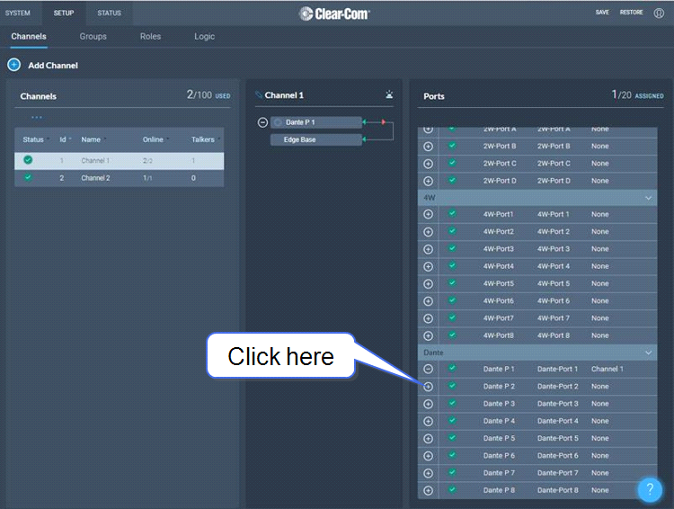 You will see available Dante ports in the Configuration page of the CCM. These ports can be assigned to channels on the Arcadia in the usual way.