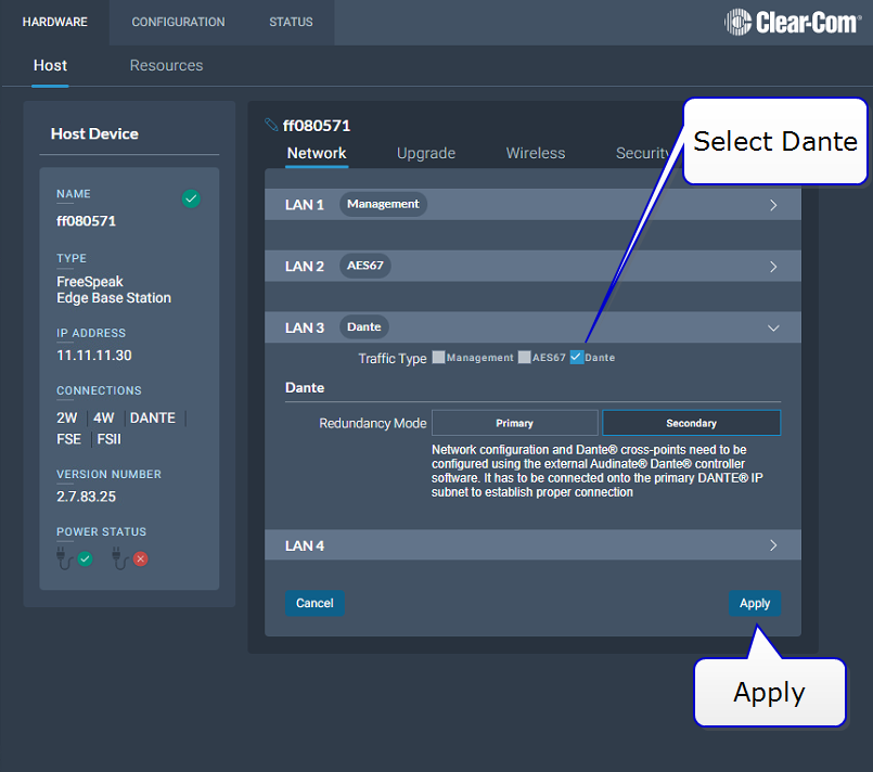 In the CCM, navigate to Hardware > Host > Network and configure Dante on the LAN connector you wish to use for Dante connections.