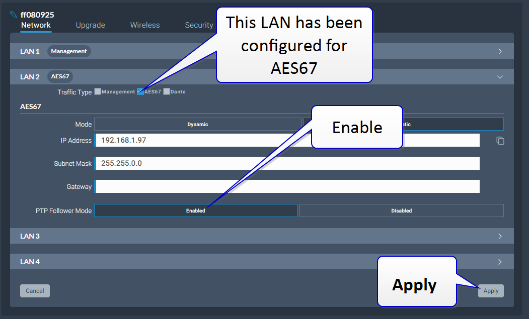 In the CCM, navigate to : Hardware > Host > Network[select the LAN that has been configured for AES67] > PTP Follower Mode