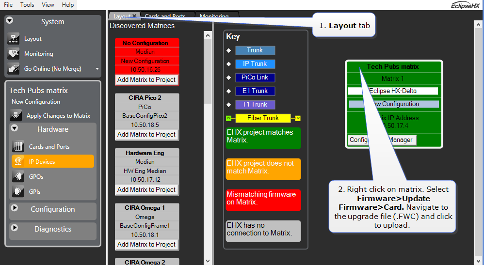 Right-click on the matrix to be upgraded and select Firmware > Update Firmware > Card.