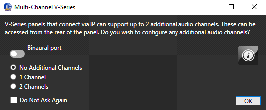 | Note: | Select Binaural port to enable binaural Partyline audio. The selector will change to 1 channel and apply the required mixer settings. If you change the number of additional channels to zero or two, the Binaural port setting is cleared. |