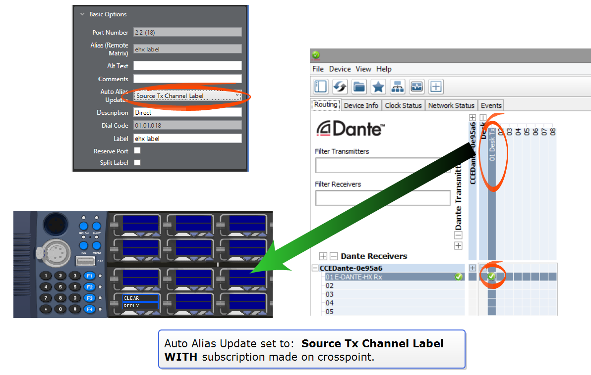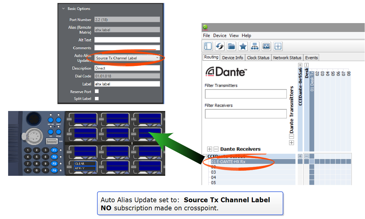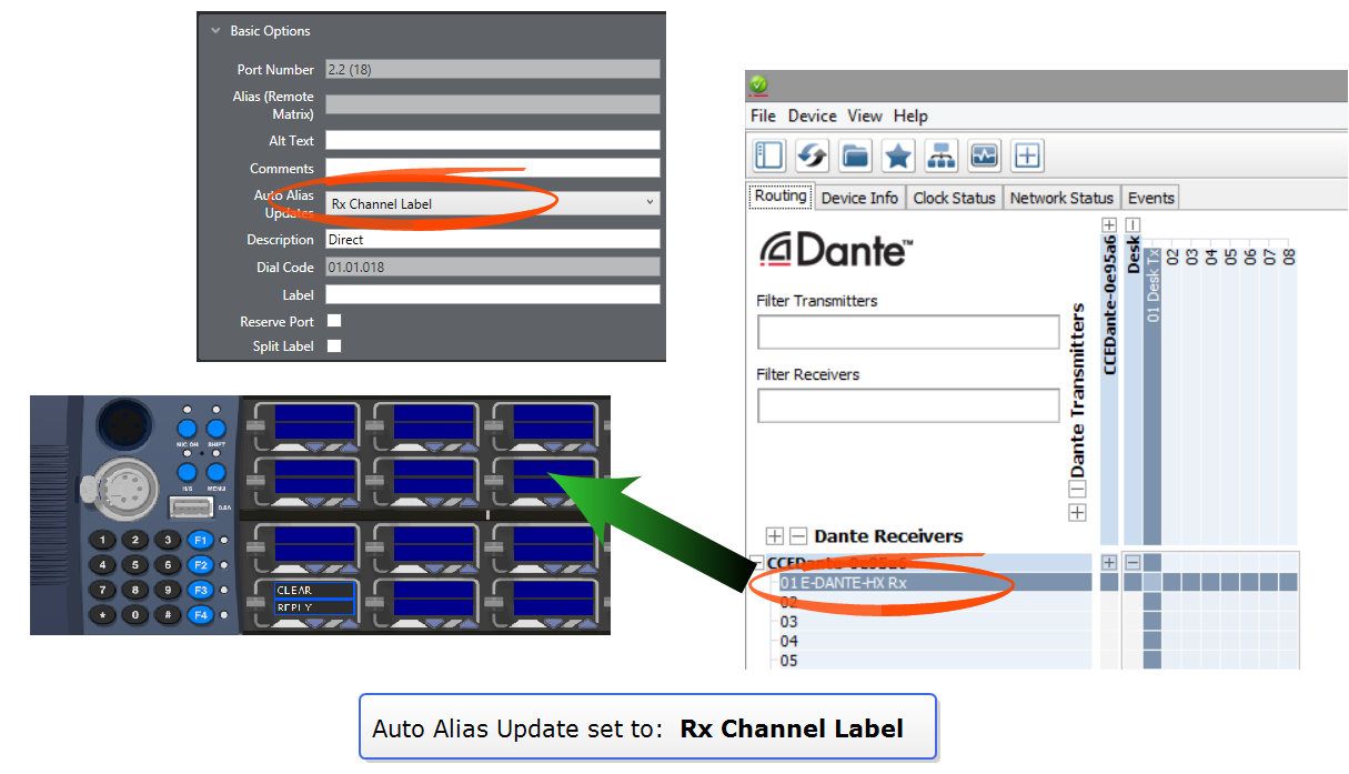 Within the Dante network, Dante enabled devices and associated audio channels are identified by names (labels). This contributes to an interface that is easy to read and use. When interfacing an Eclipse system with Dante, you can show the Dante channel names on ports using Auto Alias Updates. This makes redirecting or reconfiguring any networked audio set up much faster and easier.