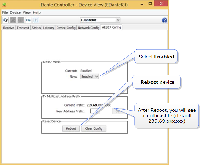 Select the AES67 Config tab and enable AES67 mode. Reboot the device. When the device has rebooted, you will see that a multicast IP address has been allocated to the device.