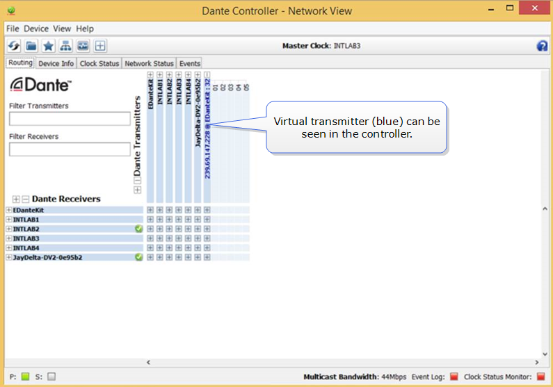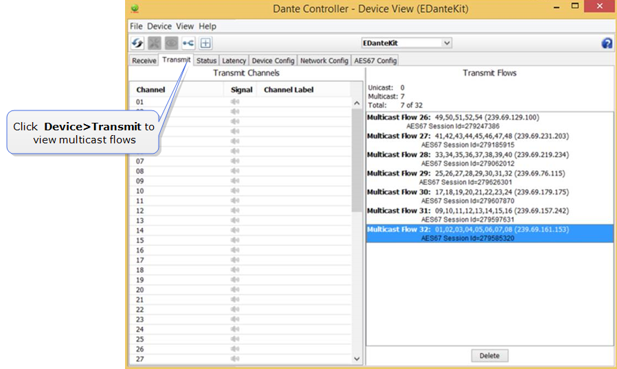 Once Flows are created, they can be seen in Network View>Device>Transmit in the Dante controller.
