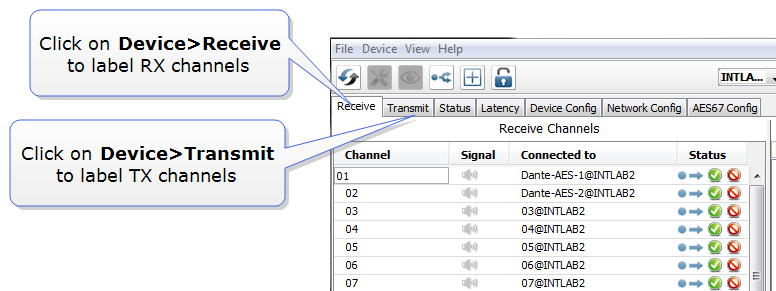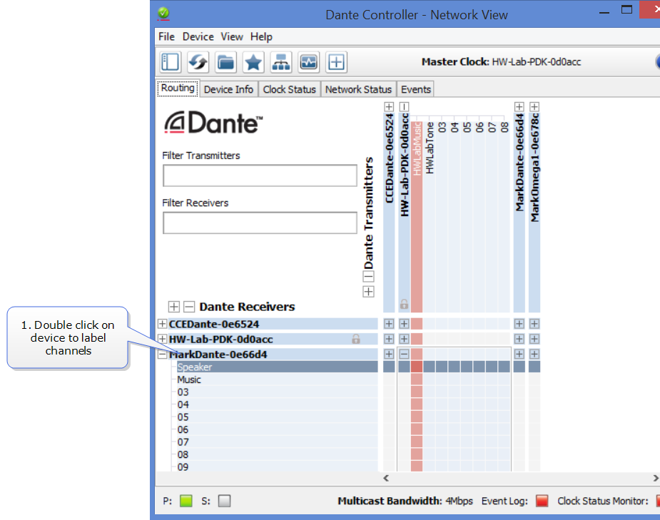- Label channels and device as required. Double-click on the device in the Dante Routing page to access device configuration options to change names and labels.