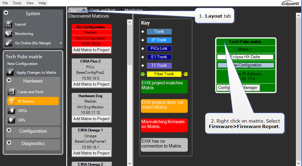 In the EHX software, navigate to the Layout tab. Right-click on the required matrix and select Firmware/Firmware Report.