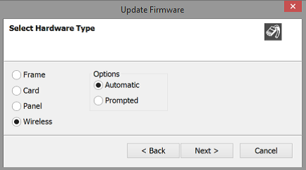 Right-click on the Frame in the Layout window, and then select Firmware > Update Firmware. The Update Firmware Wizard appears.
