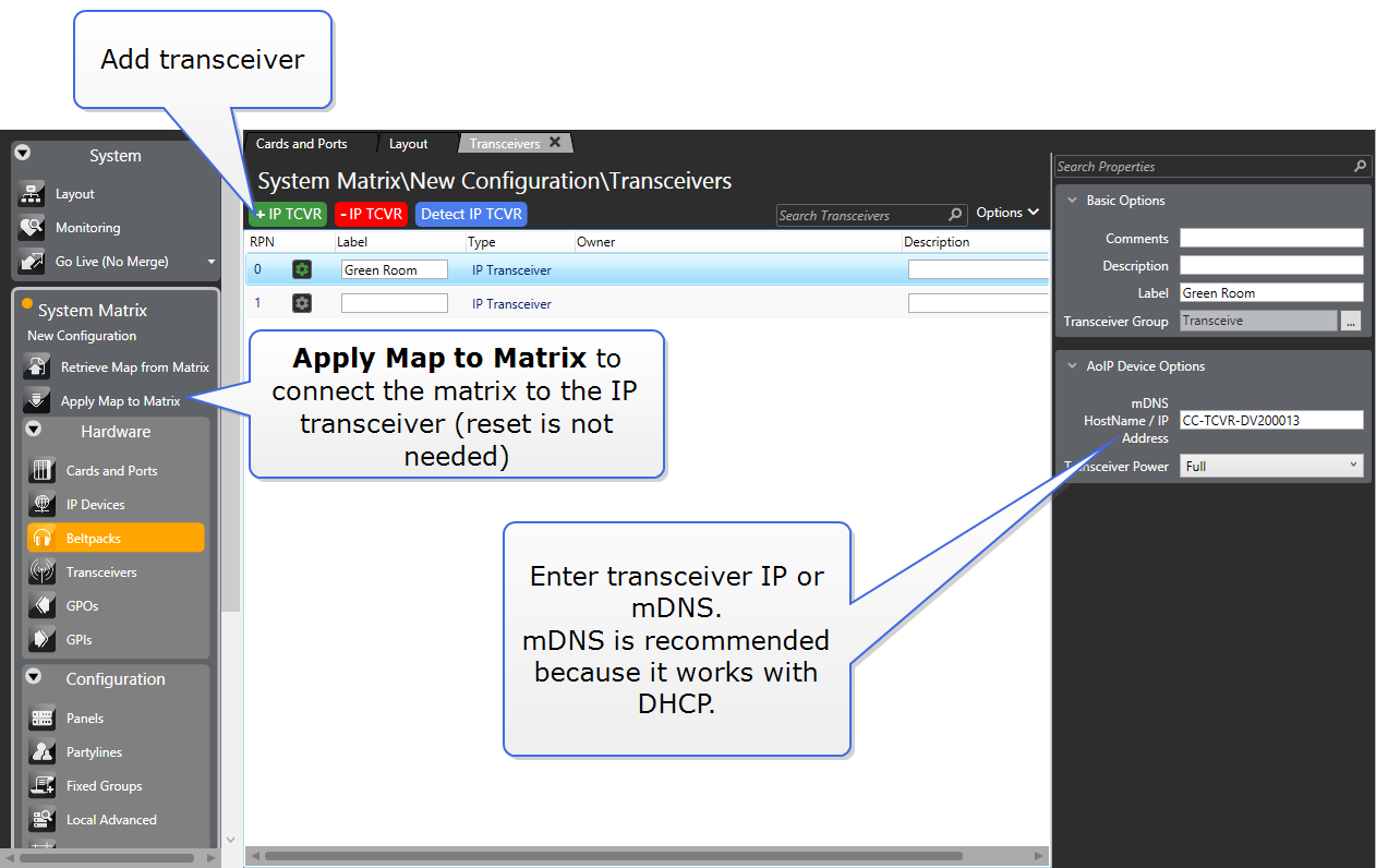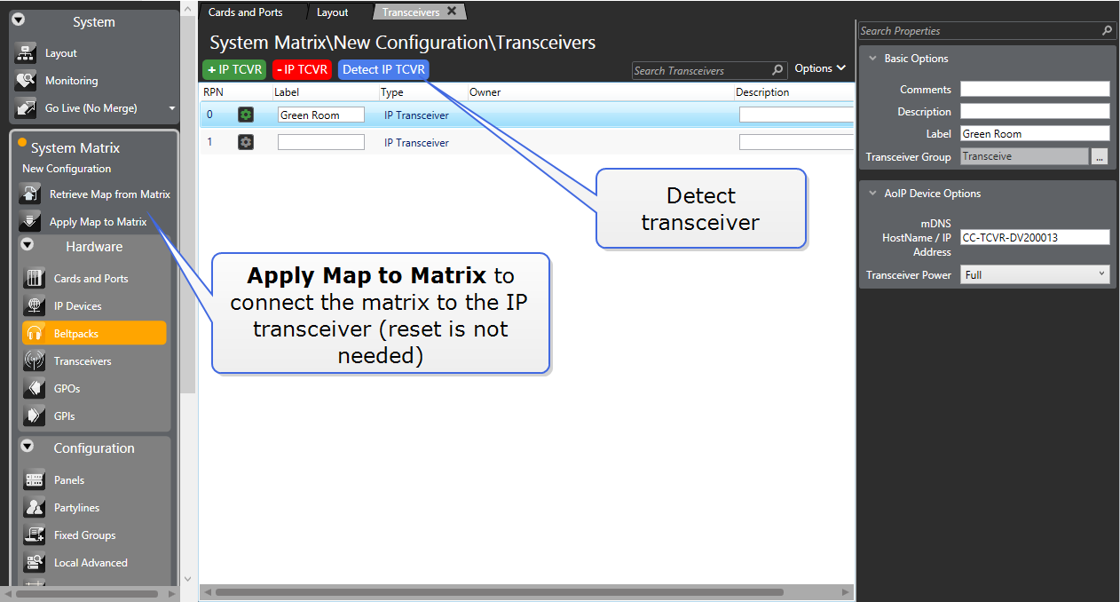 To connect the matrix and the transceiver, input the transceiver mDNS Hostname or IP address into transceiver Properties and click Apply Map to Matrix.