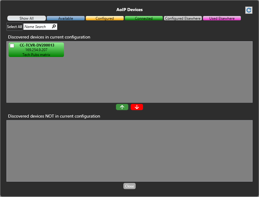From the AoIP Devices screen, use the up and down arrows to add or remove transceivers from your current configuration.