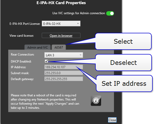 Enter the required static IP addresses for AES67 Admin and AES67 Audio.