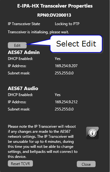 Use Detect IP TCVR to find the IP transceivers on the network (the transceiver must be on same network as IPA AES67 port, and the EHX software PC must be on the same network as the IPA admin port.). By default the E-IPA-HX and IP transceiver are DHCP enabled and automatically receive an IP address.