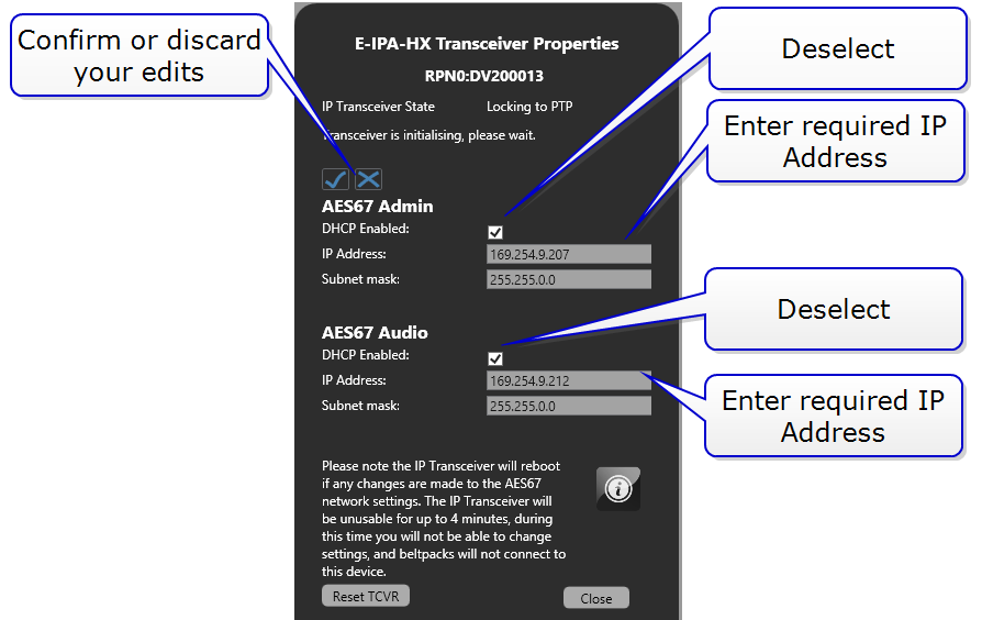 | Note: | Both the AES67 Admin and AES67 Audio IP addresses must be set to static. You cannot mix DHCP and static IP addressing on the IPT. |