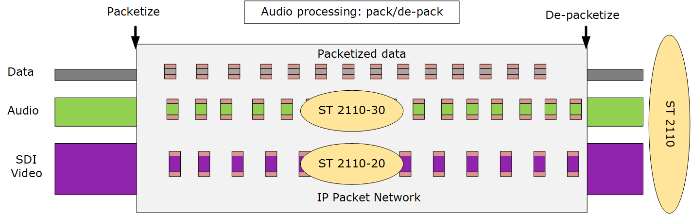 The suite specifies standards related to the carriage, synchronization and description of streams over IP for real time production and playout. Using SMPTE standards, all traffic can go over a common interface. As data is packetized by type, it is possible to access the data by type for use in different contexts. Most administrators will continue to separate traffic by priority although at the time of writing (2019) newer switches have the ability to prioritize real time media streams.