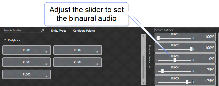 The binaural audio control setting panel applies to Partylines (conferences) on V-Series panels. It is only visible when binaural audio has been enabled on the panel role.