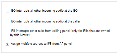 If you select this checkbox, an AP panel can assign multiple sources to an IFB destination. The IFB hears all the incoming audio from the selected sources.