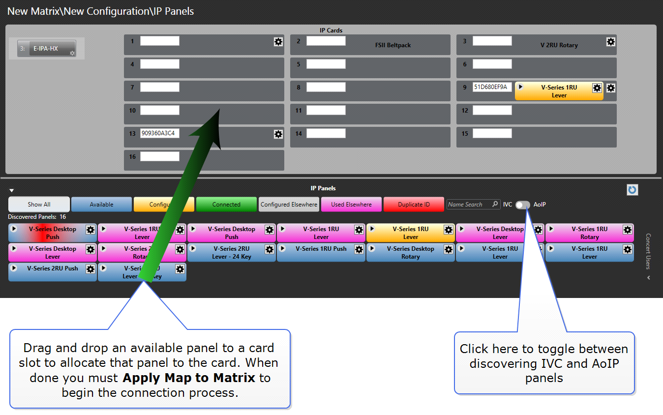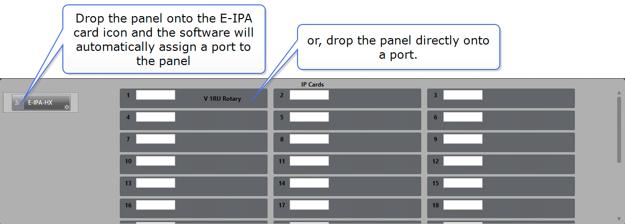 Once a panel has been discovered, it can be allocated to a card by selecting the panel and then dragging it onto the required card slot.