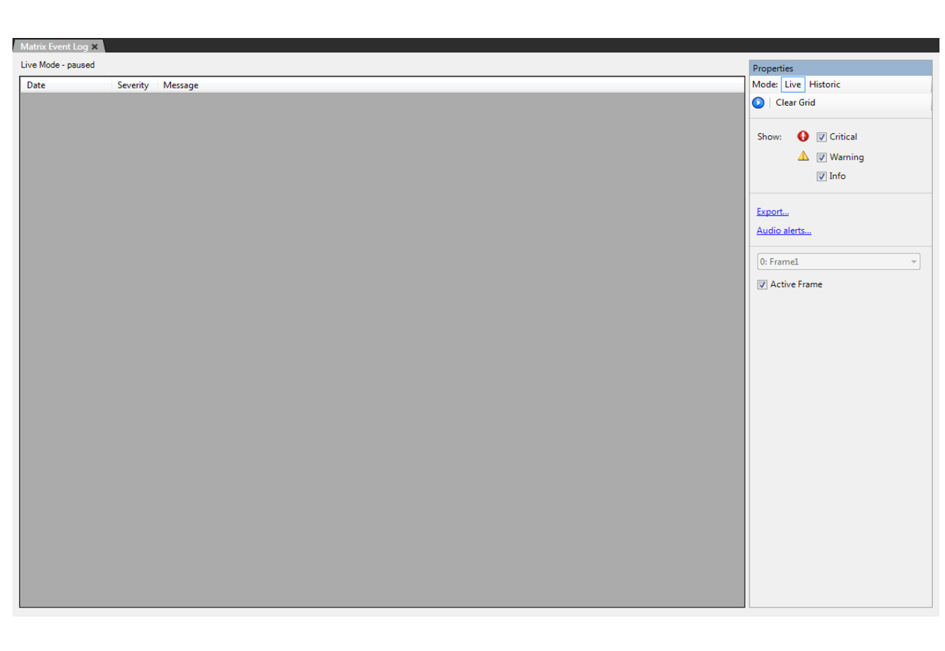 In Live mode, messages are displayed in the Matrix Event Log as soon as they are generated by the matrix. In Historic mode, EHX makes a connection to the database. The user sets search criteria and the resulting messages are displayed on screen.