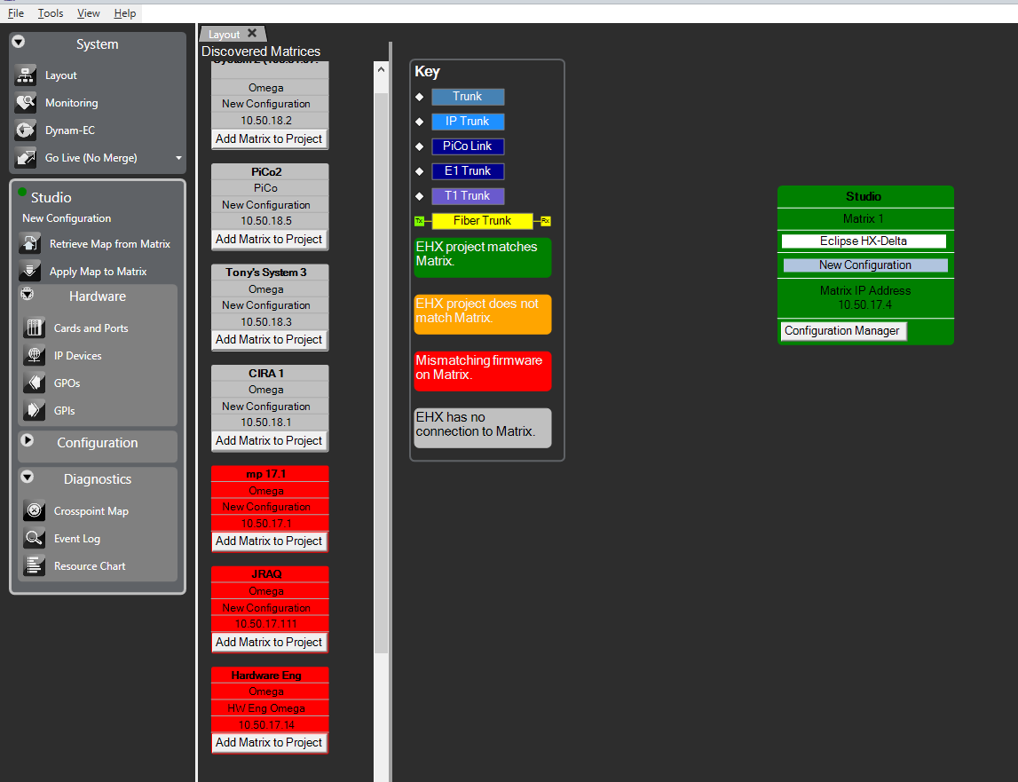The EHX PC makes a connection on either the main or backup Ethernet port of each system in the linked set. If both are up, this defaults to the primary port. If connection is lost to the currently active port on a matrix, EHX swaps over to using the other Ethernet port. If this connection is lost only on one matrix in a linked set, the others are not affected.