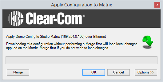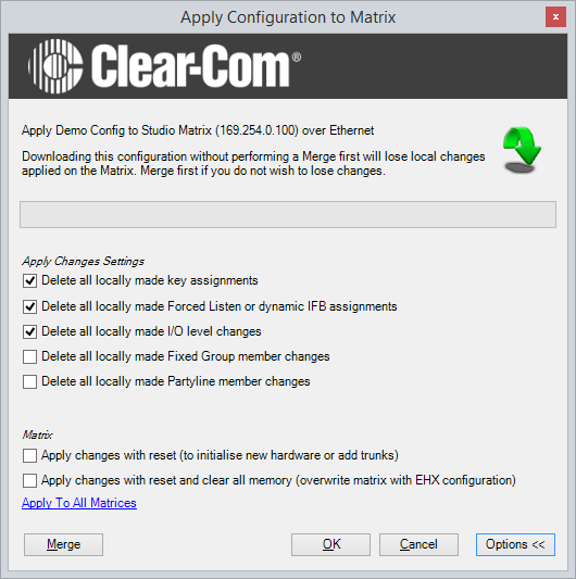 Select Merge to allow the current EHX configuration to be merged with the matrix configuration before applying the map. Use this facility if the rack configuration has been changed because of making changes in EHX Go Live mode or from assignment panels.