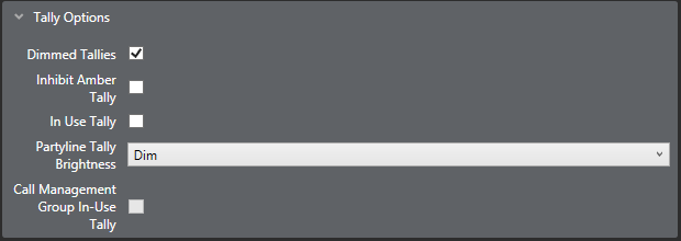 Sets the brightness level for Partyline In Use Tallies on that panel. This can be set either dim or bright. The default value is dim.