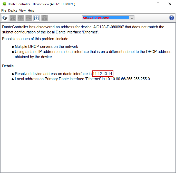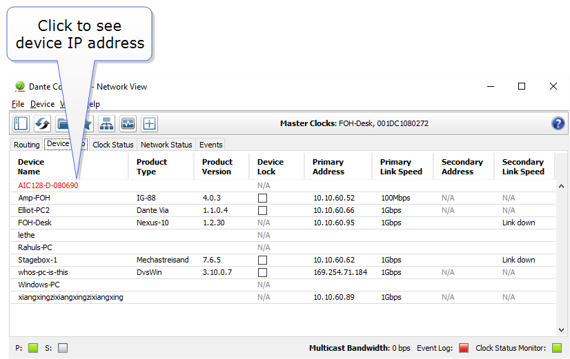 If the E-DANTE64-HX card is on a different subnet to the PC, the card will not be visible in the routing screen, but will be available under Device Info where it will show with a red highlight.