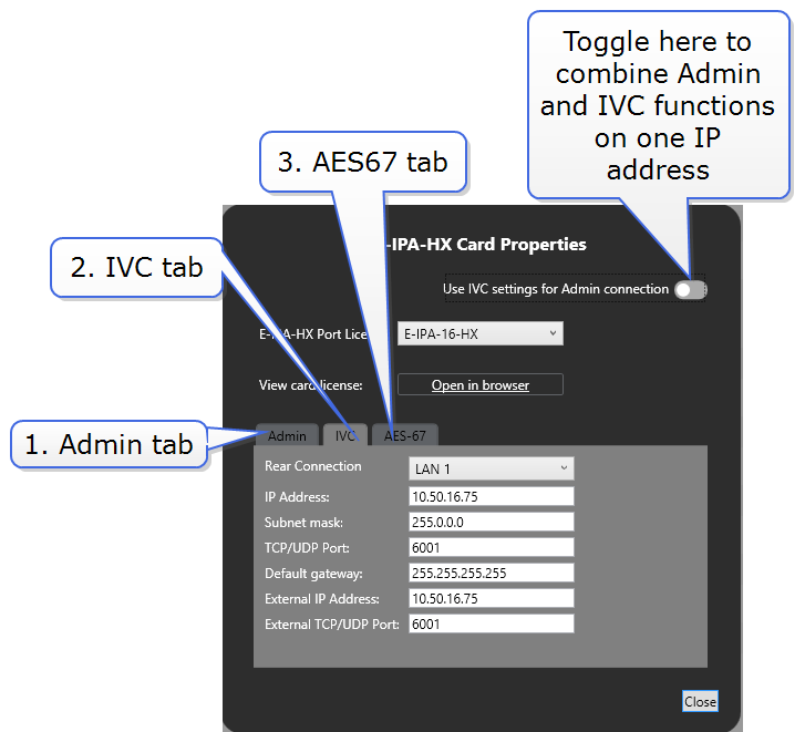 AES67 must not be connected to the same LAN/VLAN as Admin & IVC unless all three are sharing the same rear connection.