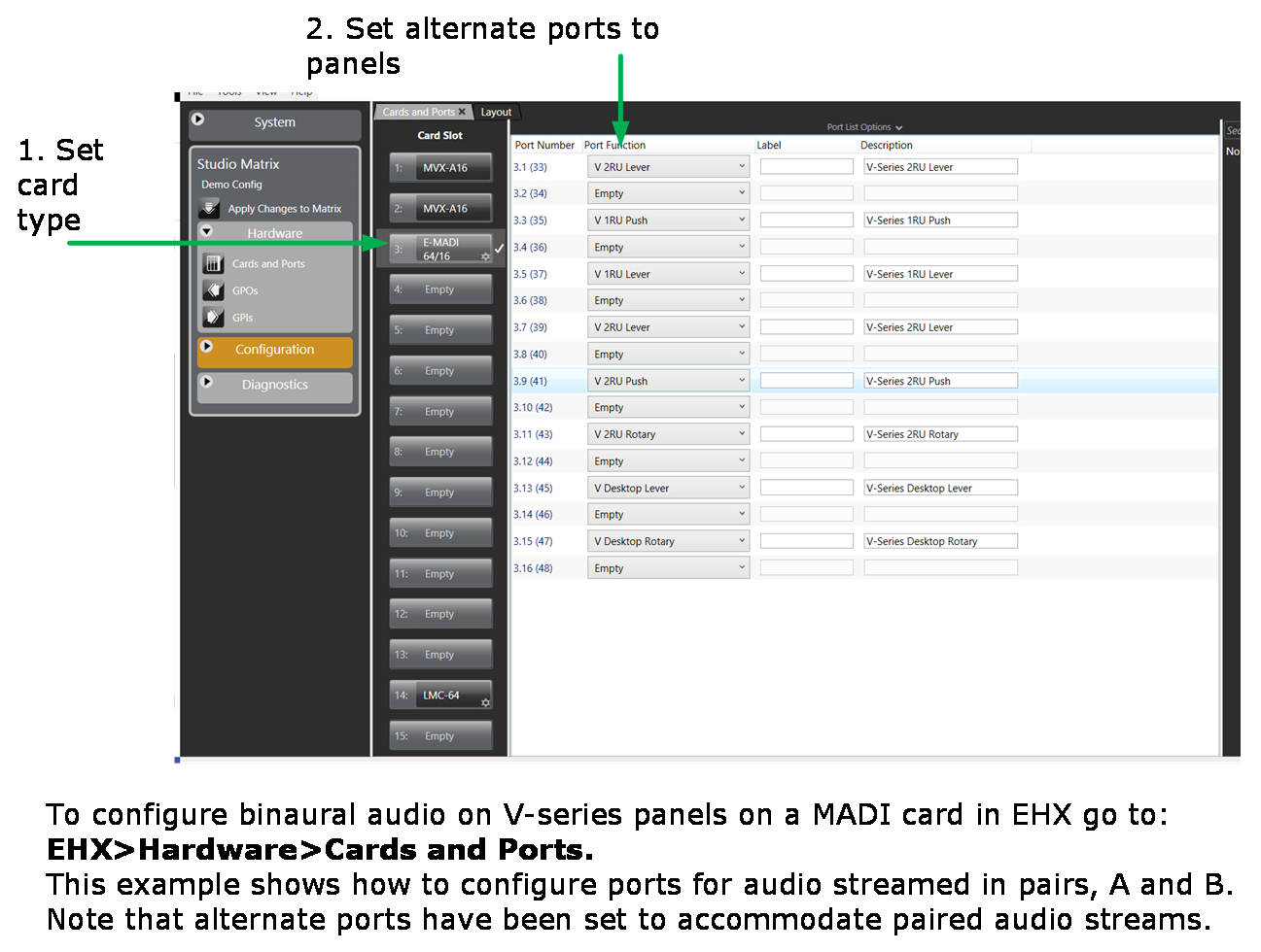 In the card/port configuration screen in EHX, the panels should be configured to the odd numbered ports (taking the first port as 1) of the E-MADI card. The even numbered ports may be left unused (Empty), leaving the panel with only the main channel audio (channel A). See the image below.