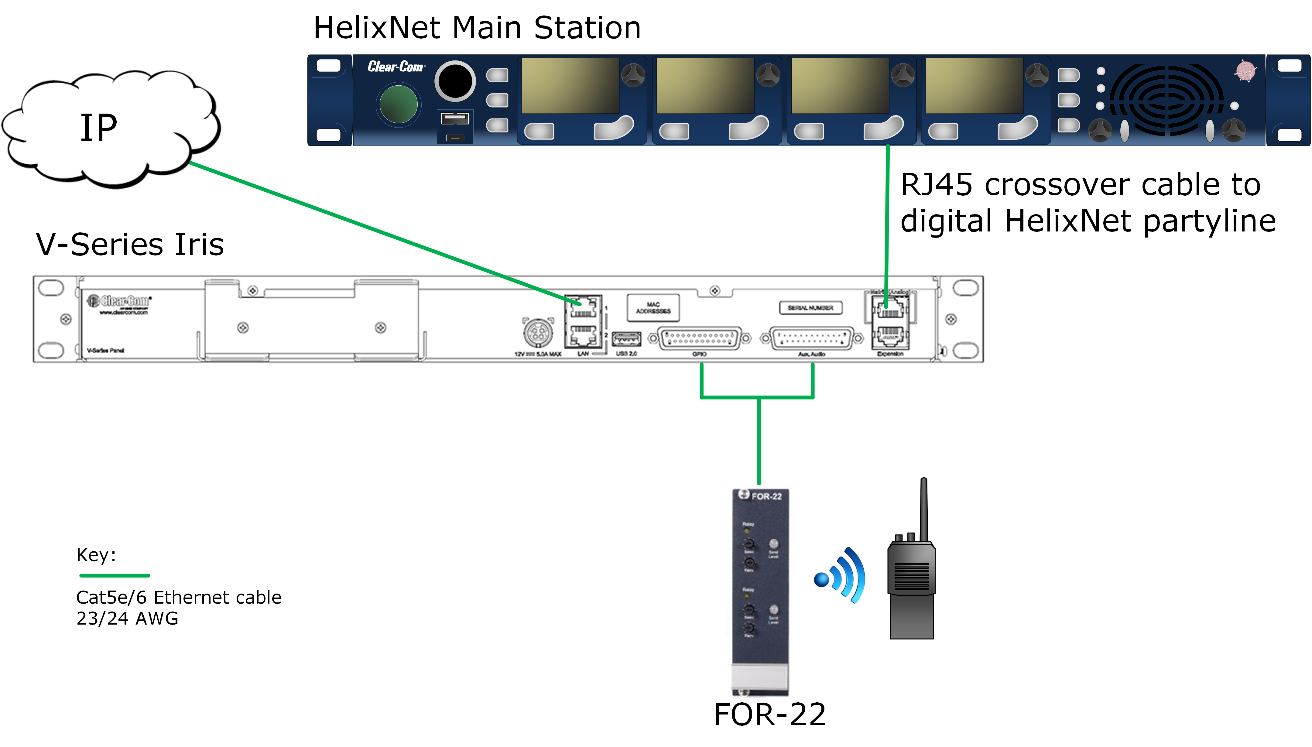 This configuration requires a cable assembly. Clear-Com support can assist in the sourcing of this and similar cables.