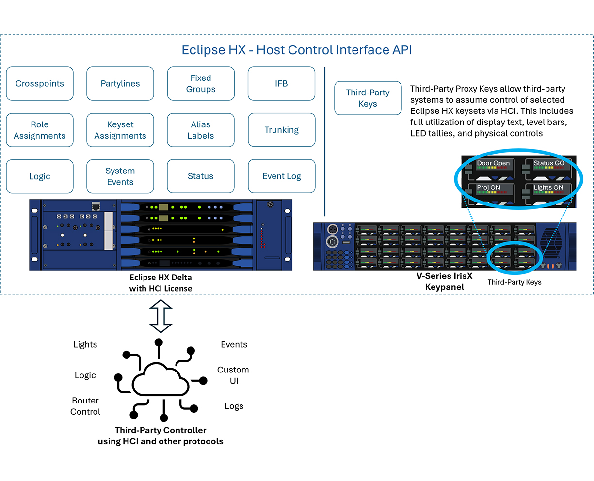 The Eclipse HX Host Control Interface (HCI) is an optional API protocol that empowers third-party software and automation systems to control—or be triggered by—an Eclipse HX intercom matrix. The HCI protocol is platform-agnostic, supporting application development in a wide variety of programming languages across multiple operating systems, with drivers available for various third-party control systems.