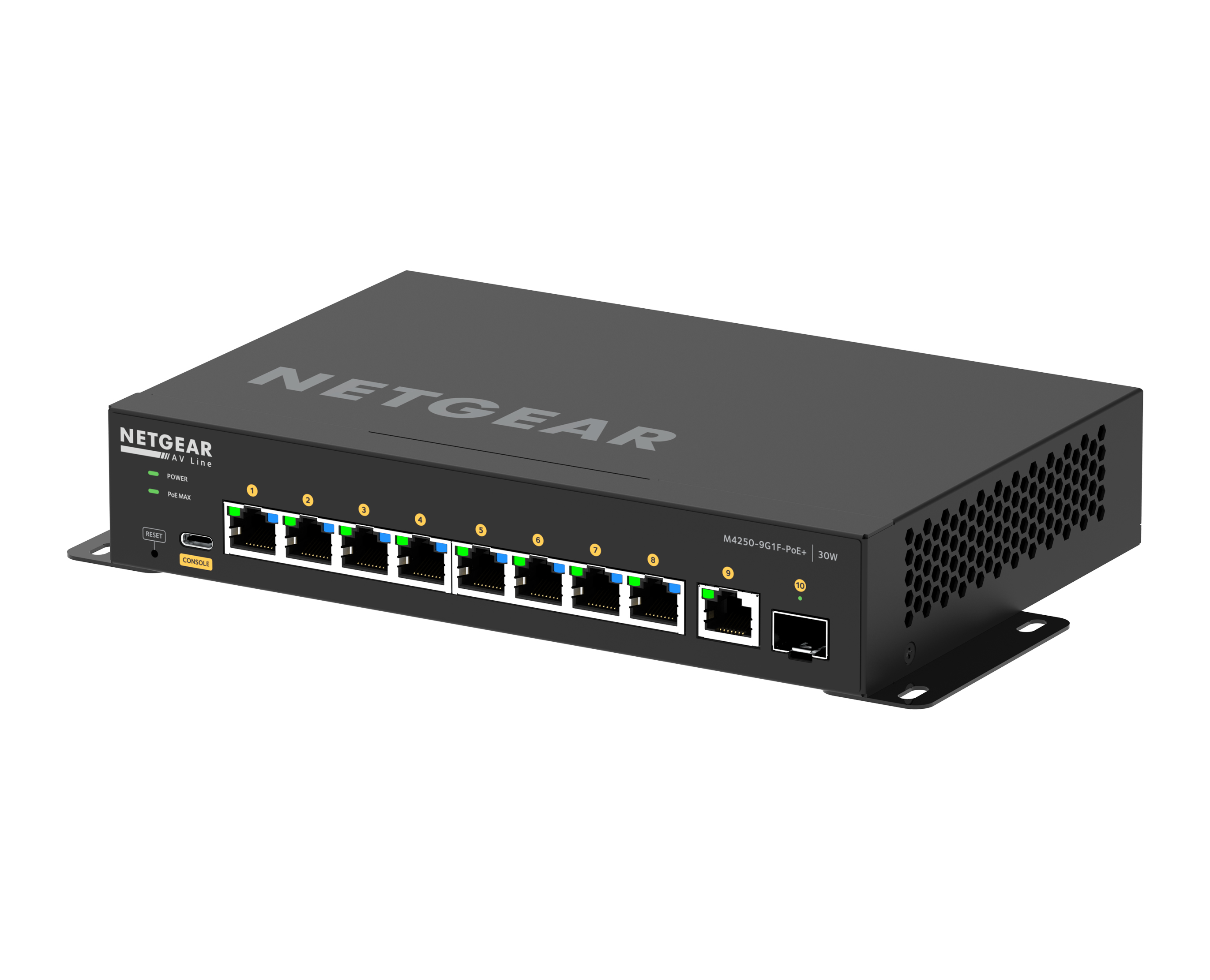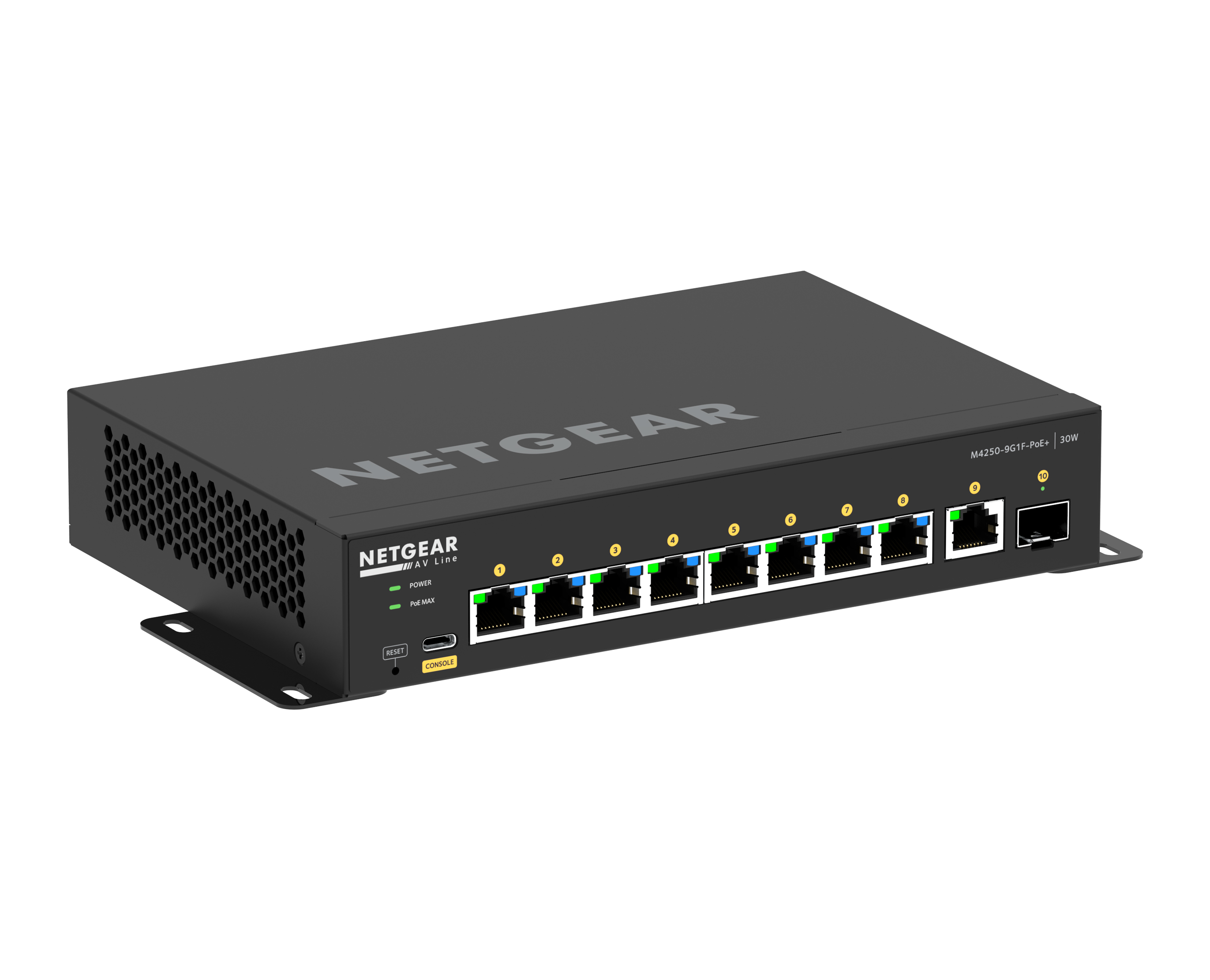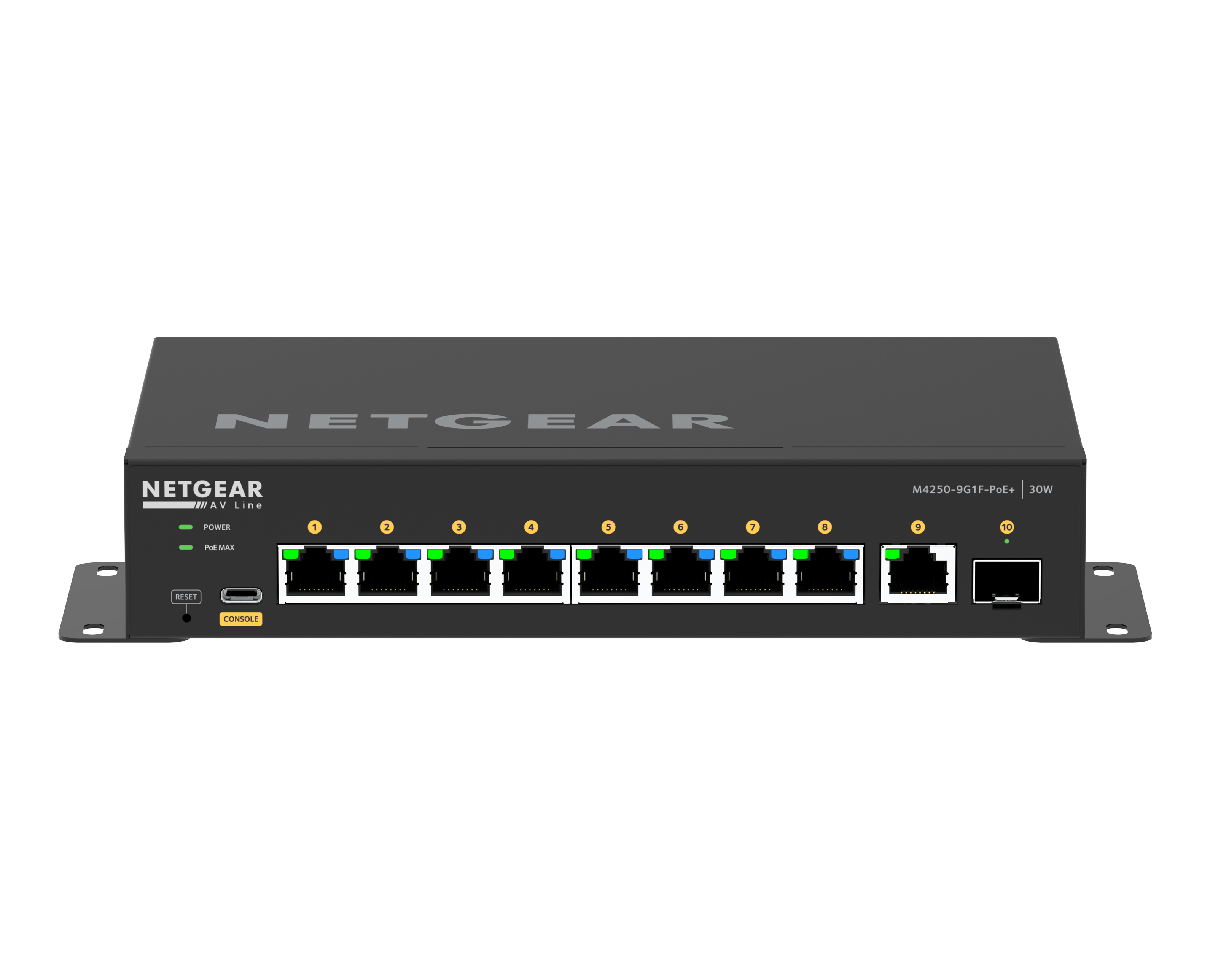 Details Ports 10 Ports Port Types 8 x 1G PoE+ 1 x 1G 1 x SFP PoE Budget 8 PoE+ (30W/port) 110W Budget Item Code M4250-9G1F-POE+ Technical Specifications Primary Port Speed: 1G Number of Ports: 10 1G PoE+ (8) 1G (1) SFP (1) PoE Ports / Budget: 8 PoE+ (30W/port), 110W Budget IGMP Support: Enhanced (NETGEAR IGMP Plus™) Jumbo Frame Support: Yes, up to 12kb AVB Support: Yes. Electronic license required, activation key sent via email (AVB4230P-10000S). Acoustics: Fan-less Power Consumption With PoE: 401W/1369.01Btu/hr Without PoE: 35.8W/122.22Btu/hr Standby without any port connection: 23.4W/79.89Btu/hr Third party support: Domotz Dimensions 210 x 40 x 140mm Weight 965g (2.13lb)