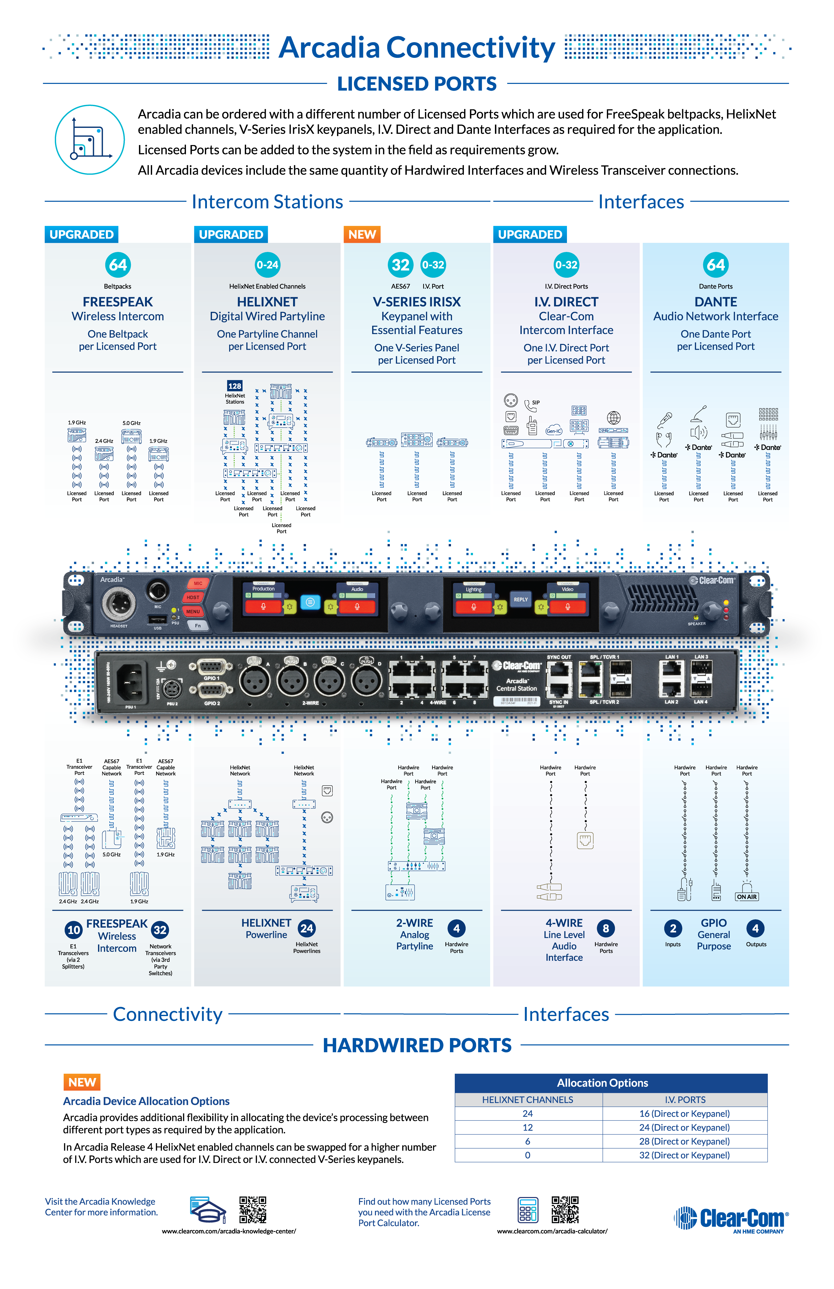 Arcadia can be ordered with a different number of Licensed Ports which are used for FreeSpeak beltpacks, HelixNet enabled channels, I.V. Direct and Dante Interfaces as required for the application. Licensed Ports