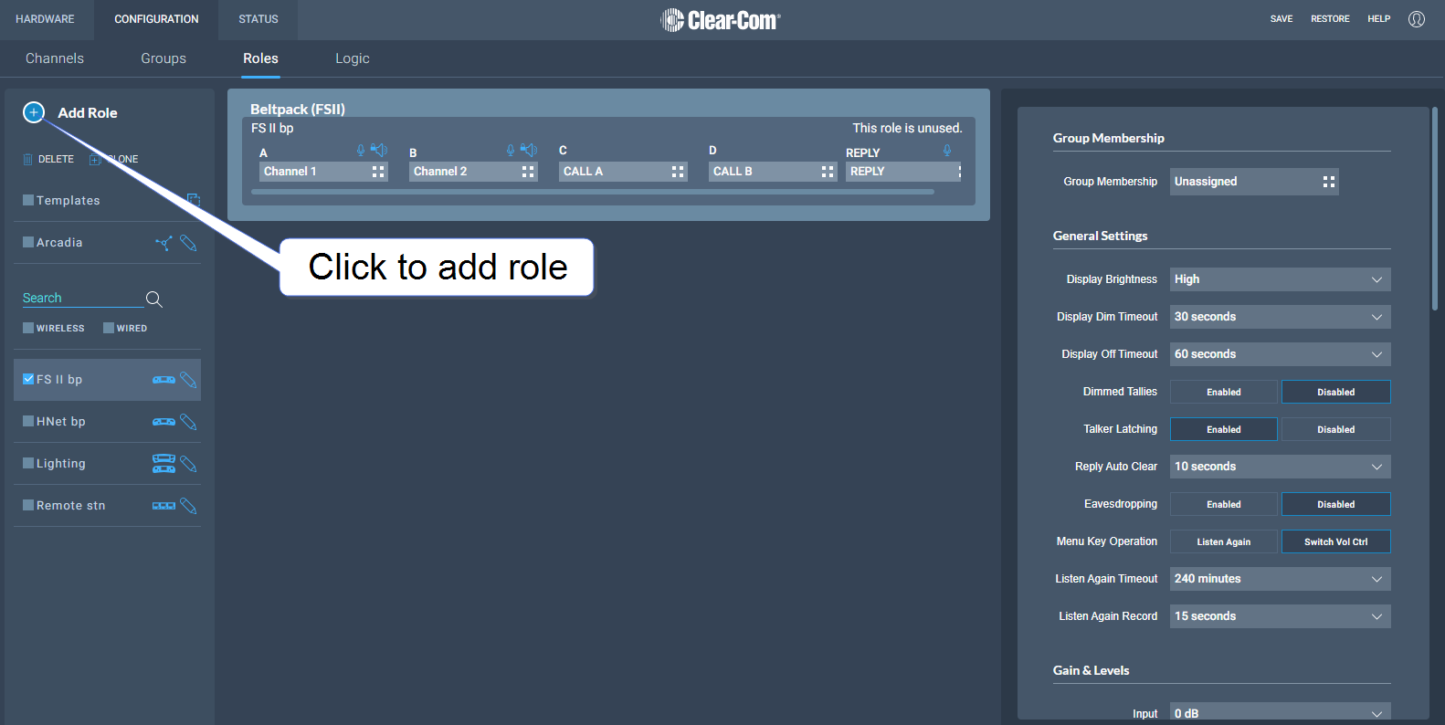 Roles are used to contol the audio configuration and other settings for beltpacks and other devices.