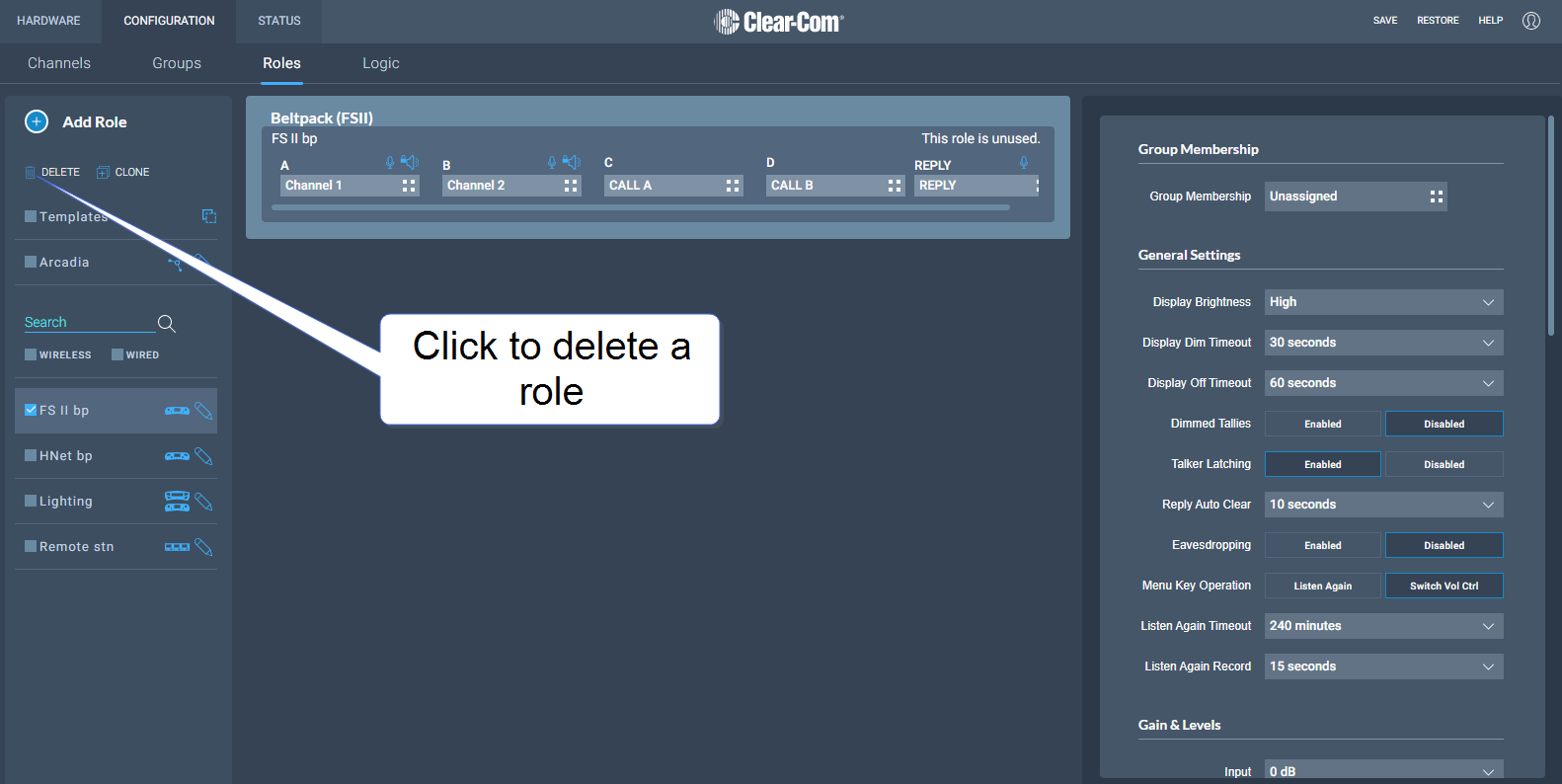 When working with FreeSpeak II, a role must be created for each beltpack or device that you use. This relationship is 1:1. If you want the same settings for multiple beltpacks, you may decide to clone an existing role.