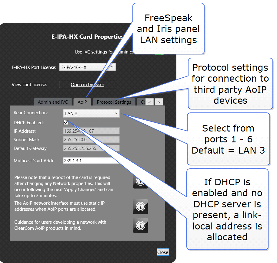 Clear-Com AoIP devices need careful setup of IP settings as the E-IPA card uses up to three IP addresses. It also requires careful setup of network switches. For details see Clear-Com AoIP Network Recommendations.