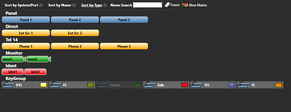 • Organized by type (for example, Panel, Direct (four-wire), Ident, Monitor, Key group, FreeSpeak® Beltpack Role or FreeSpeak II™ Beltpack Role).