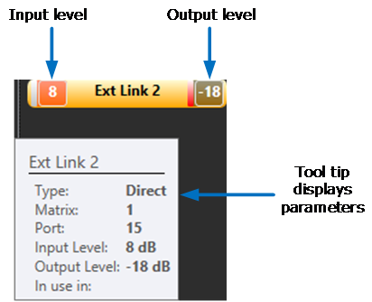 The input and output levels are displayed on panels, four-wires, idents and monitors while they are in the palette. The (output) level of idents and the (input) level of monitors is also displayed when they are assigned to conferences (but not Port Viewers).