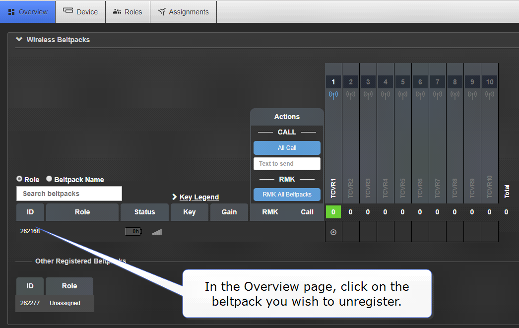 Sometimes, you might want to unregister beltpacks from the Base. This is generally for housekeeping and security reasons. For example, you work with two separate studios that both use wireless beltpacks and need to be confidential.