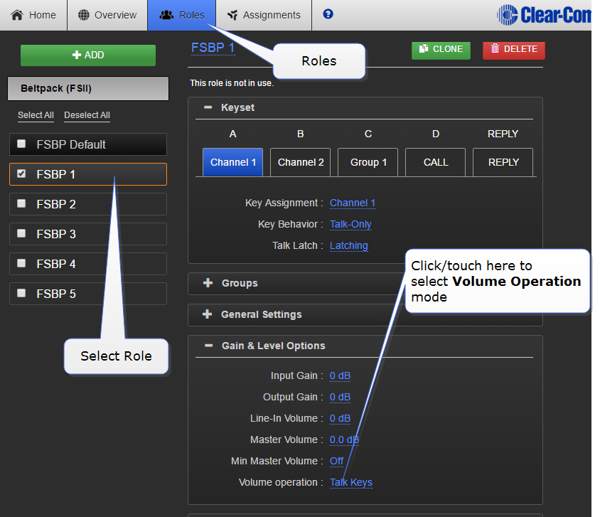 Volume operation on beltpacks can be set according to user preference. Control volume operation via the beltpack's Role.