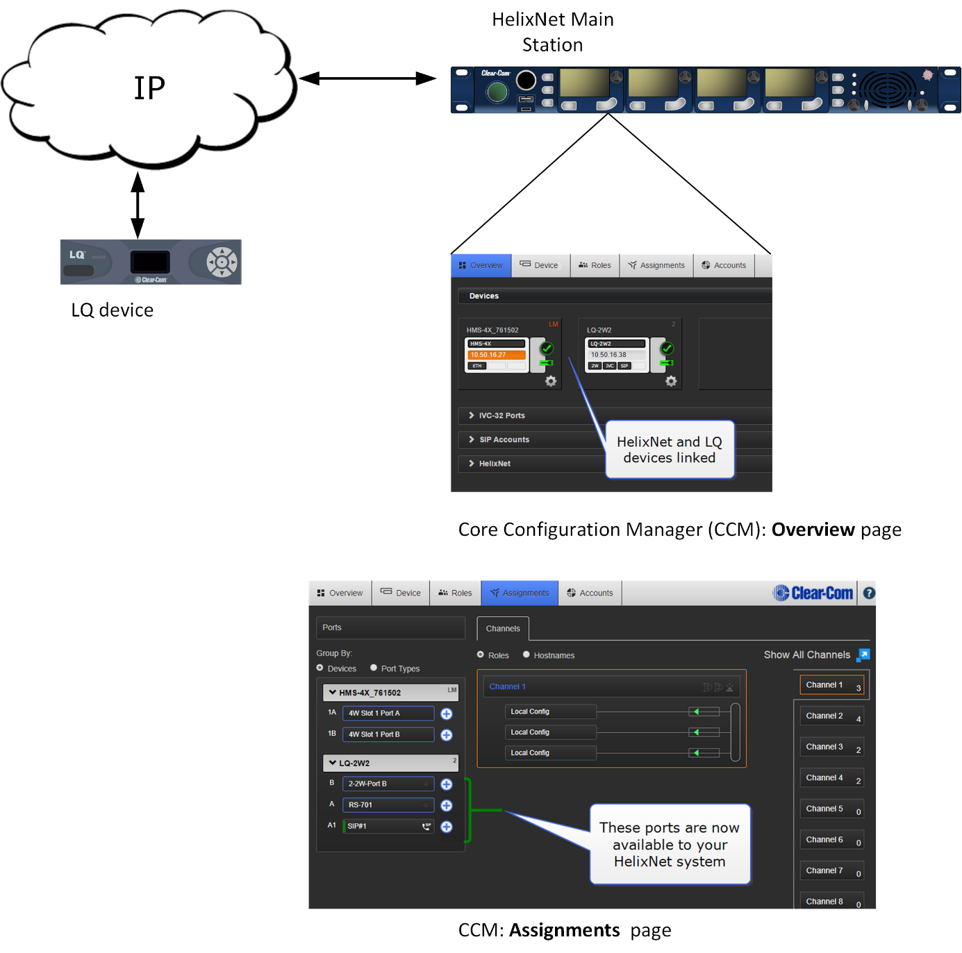 Once an LQ unit is linked to an HMS in a Link-Group, all ports on the LQ unit are visible in the CCM and available to be placed in a HelixNet Channel. Once a port is in a Channel, audio from that port can be routed anywhere within the system.