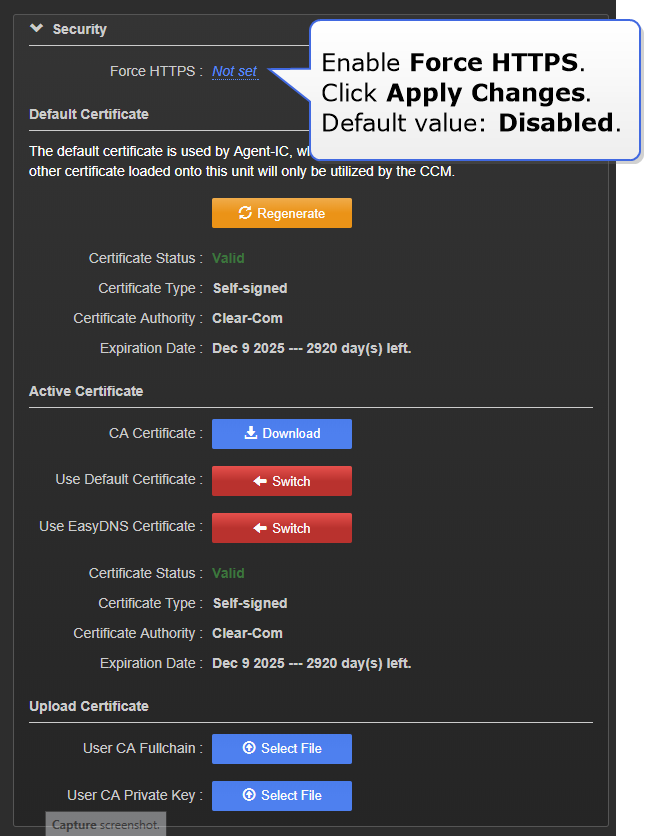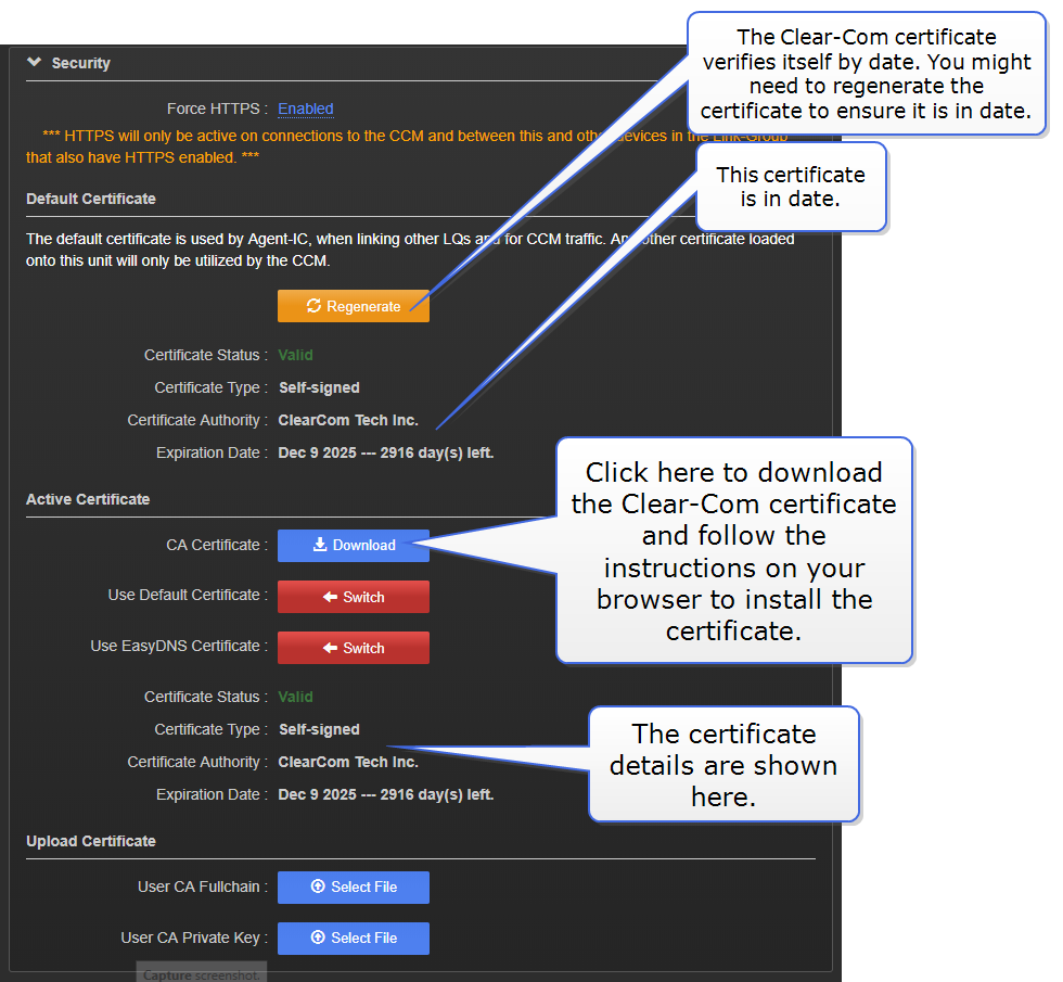 | Note: | Different browsers (for instance, Chrome, Firefox) have different methods for handling certification. This is beyond the control of Clear-Com. You may need to refer to the instructions that come with your browser for this. |