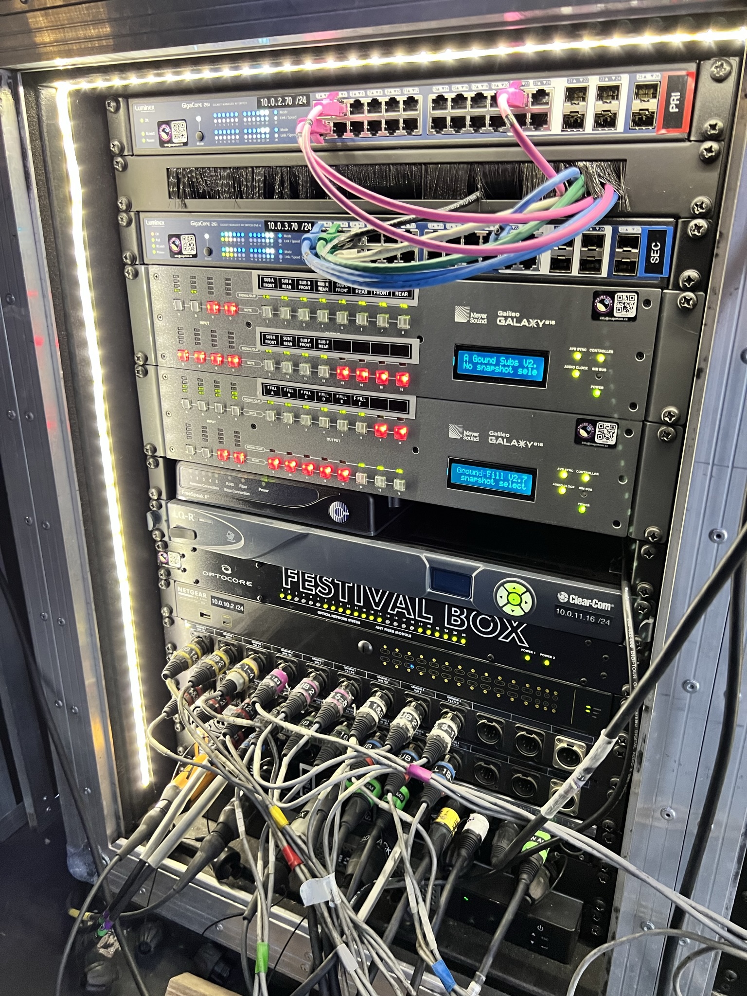 While the team intends to move to a fully digital system in the future, they’ve intentionally maximized efficiency with their hybrid analog/digital system utilizing LQ Series IP Interfaces. For example, each tech station on-site has a port labeled “comms.” Each tech has a HelixNet beltpack, and when they get to a station where they need to service or administer support, they can simply plug in and instantly connect to the network.