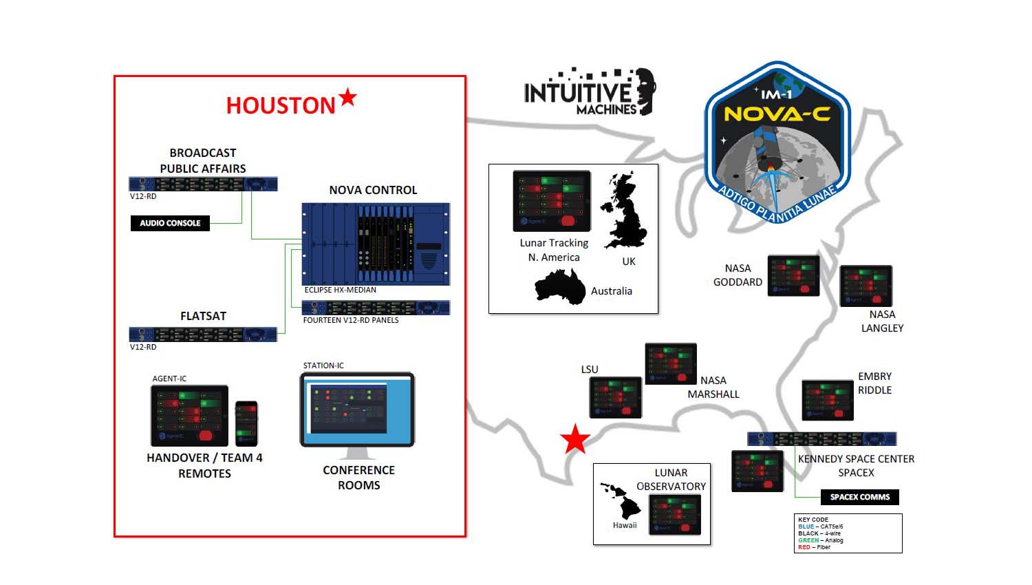 Houston-based Intuitive Machines (IM) is a premier provider and supplier of space products and services enabling sustainable exploration of the Moon, Mars and beyond. They have recently completed construction of Nova Control, a state-of-the-art mission control center in Houston that will track and support IM’s upcoming, back-to-back-to- back missions to the Moon (IM-1, IM-2 and announced this week, IM-3). Intuitive Machines’ Nova-C spacecraft will be launched on a SpaceX Falcon 9 Rocket to conduct first-of-its-kind lunar research and exploration of the Moon’s surface. Nova Control will serve as the nerve center for communications, connecting ground stations and various payload* customers around the world using Clear-Com’s Eclipse® HX Digital Matrix System and Agent-IC® Mobile intercom App.