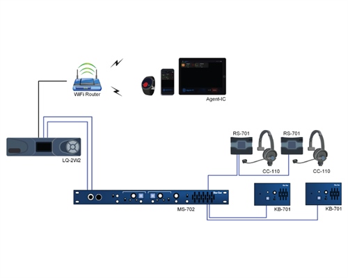 LQ Series v4 allows an LQ or LQ-R device to house up to eight licenses for Agent-IC. In this scenario, an MS-702 with two beltpacks and two speaker boxes is connected to an LQ-2W2 throwdown box. The LQ IP interface is connected into a Local Area Network (LAN) housing a WiFi router. Android or iOS mobile devices with licensed Agent-IC applications can then be used to communicate with users on the beltpacks and speaker boxes.