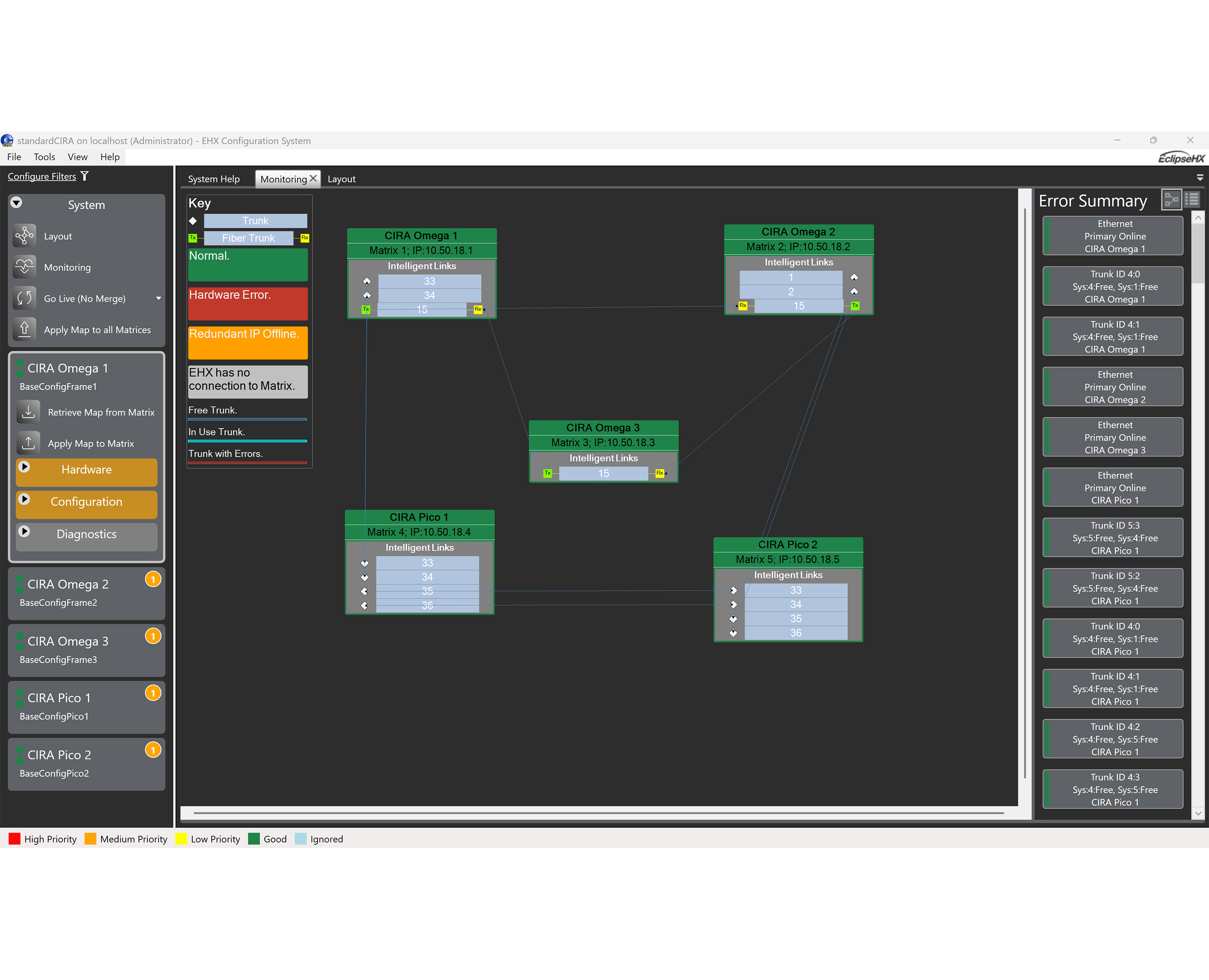 The Windows-based EHX configuration software configures and controls the operation of one or more Eclipse HX matrices. EHX can both download and upload system configurations to a target Eclipse HX matrix for either offline editing or live changes.