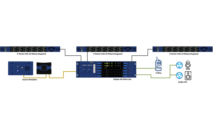 The Eclipse HX Delta Lite constructs smaller intercom systems while retaining the full configuration power of EHX configuration software. Delta Lite includes 16 or 32 simple plug-and-go analog ports, supporting V-Series IrisX keypanels, Eclipse Interface Modules, or generic line level audio interfaces. The second Interface Card slot provides optional versatility, accepting E-IPA, E-DANTE, or E-MADI cards for FreeSpeak Wireless, networked, or digital audio interfacing. Delta Lite allows for a field upgrade to the higher capacity Delta as needs grow.