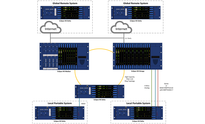 Eclipse HX delivers effortless interfacing across all scales, locally supporting Analog, Dante, MADI, AES67, SMPTE 2110, and Clear-Com’s LQ Series. For wide-area operations, native SIP telephony and Instant Voice technology provide robust global internet connectivity. Unifying these is Intelligent Linking, a self-managed mesh trunking capability that automatically routes audio through any available circuit type, ensuring resilient communication between Eclipse HX systems.