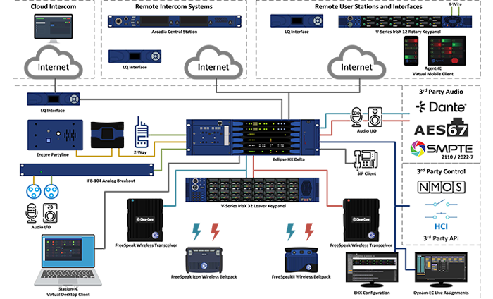 The fully integrated, redundant, and modular Eclipse HX system provides tailored connectivity. A wide range of user stations—including V-Series IrisX keypanel, FreeSpeak wireless beltpacks, Agent-IC, and Station-IC virtual clients—tailors communication to any environment. Local communication uses high-performance networks, while global communication is highly resilient via Clear-Com’s Instant Voice protocol. Third-party interfacing is achieved using E-IPA, E-DANTE, and E-MADI cards, supporting standards like AES67, Dante, MADI, and SIP telephony. All are managed via EHX configuration and optional Dynam-EC, alongside GPIO and HCI API for external control.