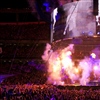 Mathematics plays out on five stages placed around the floor of the venue, usually a stadium: one center stage with a revolving rim allowing 360-degree visibility for (and of) Sheeran, and four platforms for members of his band who - in a first for Sheeran - occasionally accompany him, each at the bottom of six “masts” that act as counterweights in a sophisticated pulley rigging setup for a 42-ton halo above the main stage. As if that wasn’t enough, pyro also figures heavily into the spectacle, with flame throwers used multiple times, culminating with a fireworks display as a finale.