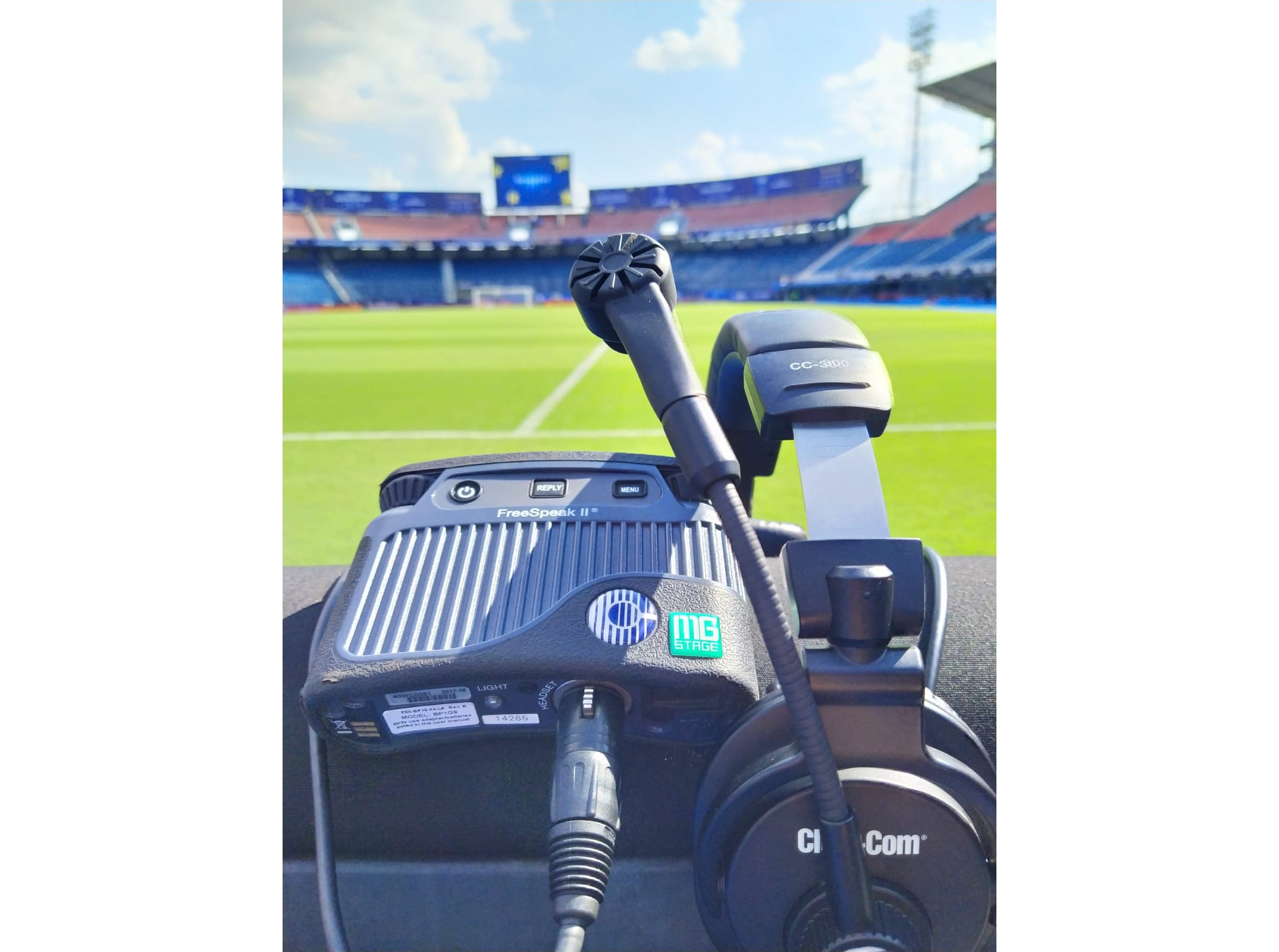 For the Conmebol South American Cup Final, MG Stage placed one FreeSpeak II transceiver along each sideline. The production team used 10 FreeSpeak II beltpack on the sidelines, behind the goal—the waiting area for the shows and ceremonies—and one member was in the tv booth. “The coverage was smooth in all areas, across the field and even in the booth high up in the stadium”, said Acha. “The stage managers stationed around the field were able to clearly give directions and talk to one another.”